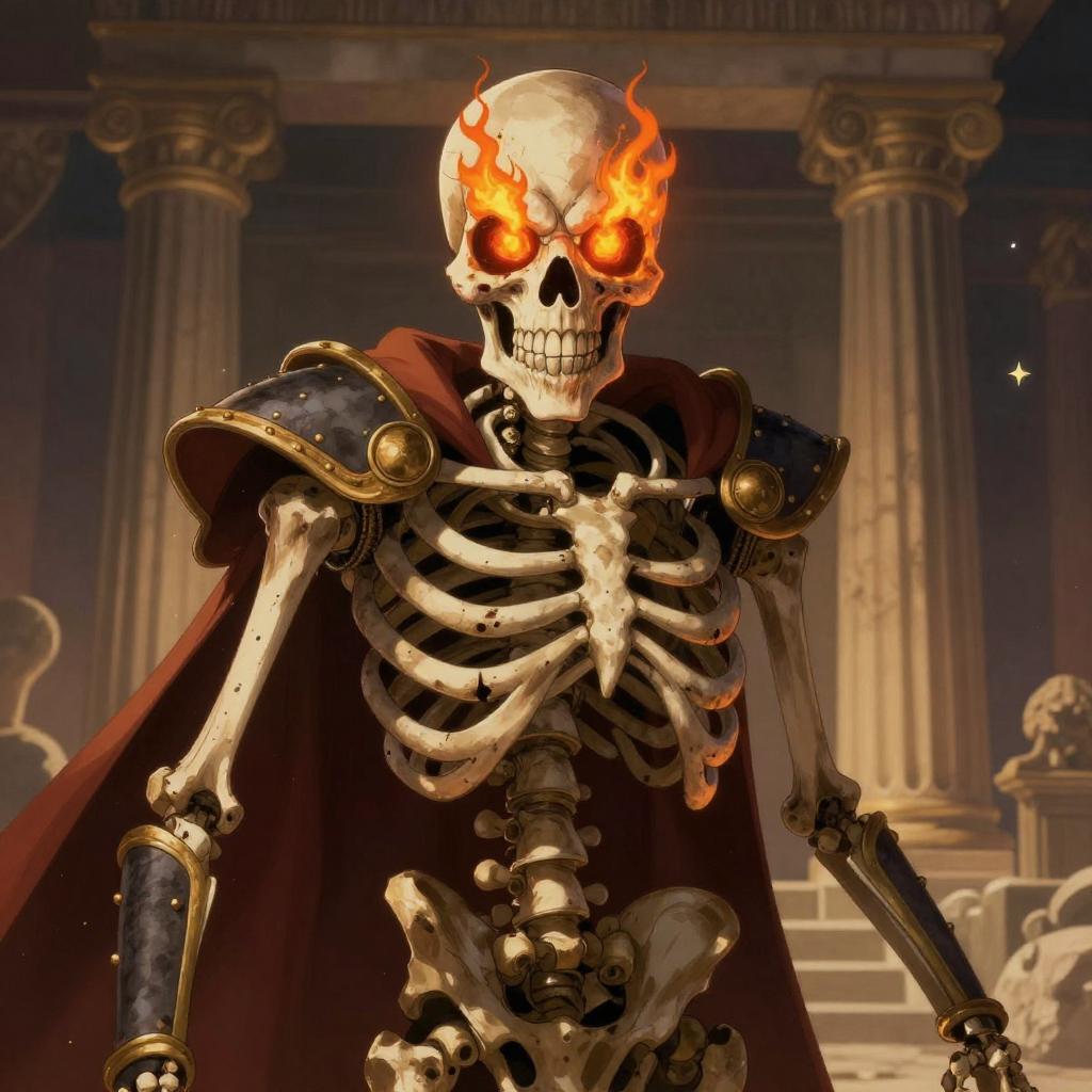 Undead skeleton, creepy, hades-8500, cartoon, flaming eyes, portrait, looking at viewer, ancient greece, (realistic), solo, soft lighting, shading, comic, (dark outlines:1.2), epic, fantasy, street fighter, warrior, overwatch, splash art, stars
