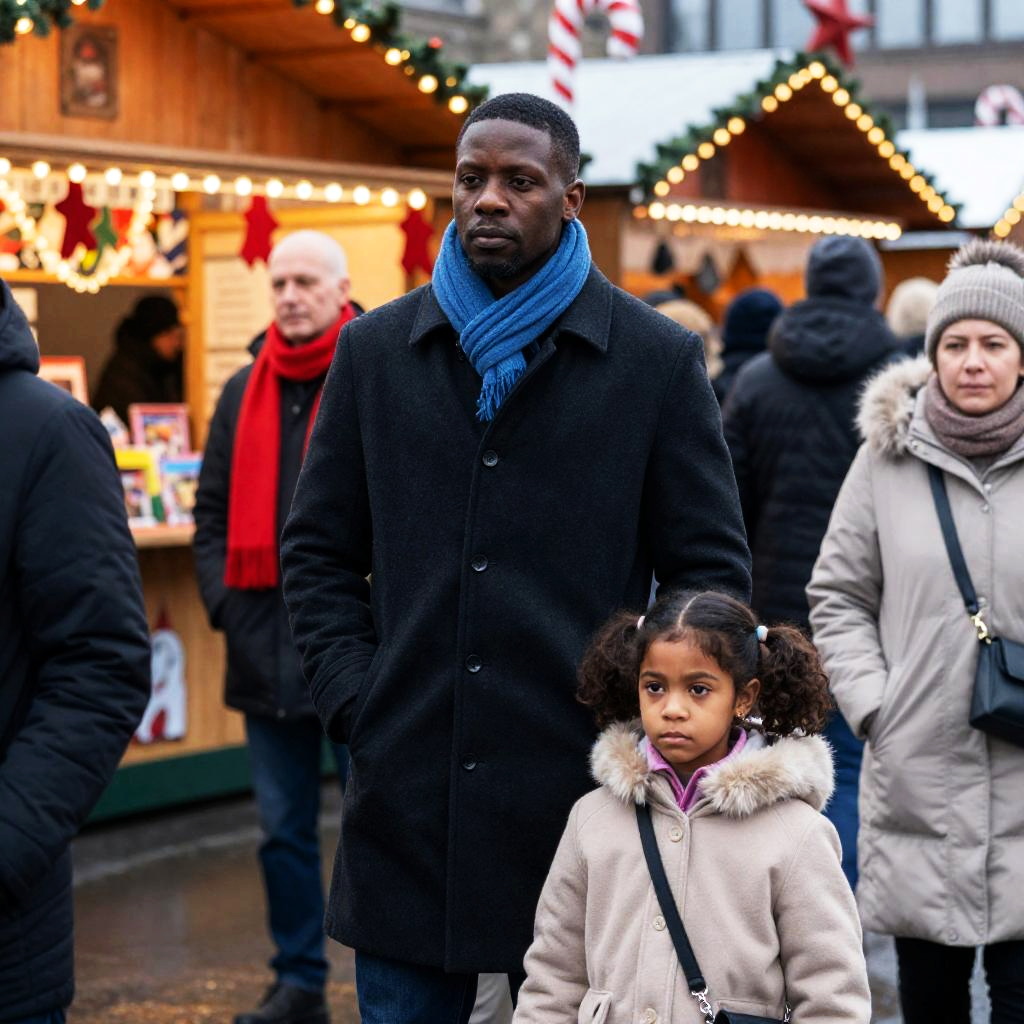 Photograph of an outdoor Christmas market. Black woman with braided hair, glasses, and black coat talking to a blonde woman in a brown fur-trimmed coat and pink hat. Bald man in green jacket on the left, other people in background. Red banner with Christmas decorations in the background. Blonde woman's back facing camera, arm raised. Intense expressions on black woman's face.