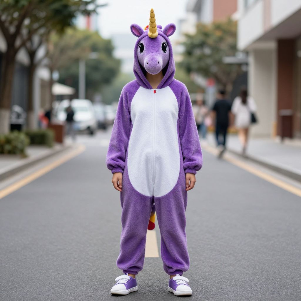 Purple Unicorn Onesie, in a purple unicorn costume standing on a street