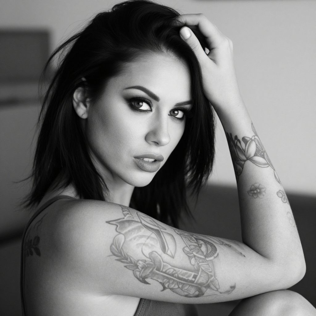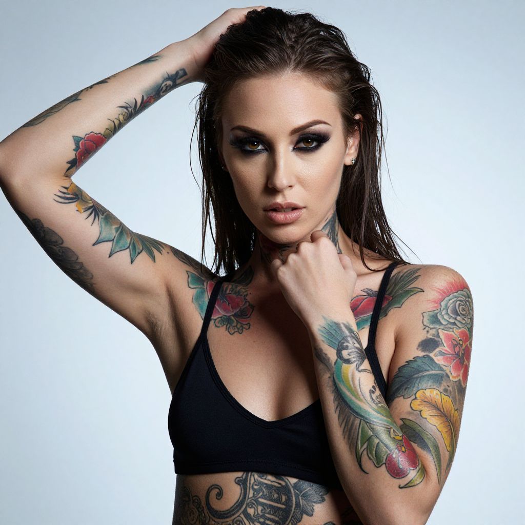Photograph of a tattooed woman with wet, dark brown hair, wearing a black, low-cut top. She has extensive colorful tattoos covering her arms, neck, and chest. Her right hand is in her hair, and her left hand rests near her chin. She has dark, dramatic eye makeup and a serious expression. The background is a simple, light blue gradient.