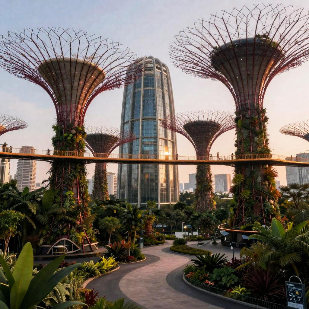 Photograph of a modern botanical conservatory with a glass and steel dome ceiling. Two tall, cylindrical towers are adorned with greenery and climbing plants. Central large, umbrella-shaped structures also covered in vines. The floor is surrounded by various tropical plants, including palm trees and flowering plants. Sunlight streams through the glass, casting warm light on the plants. A few visitors, dressed in casual clothing, walk along a paved pathway in the center. The overall atmosphere is lush and vibrant, blending natural and architectural elements seamlessly.