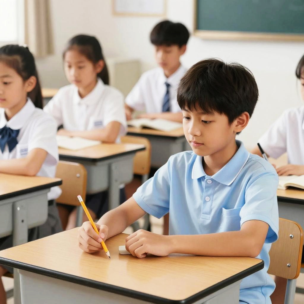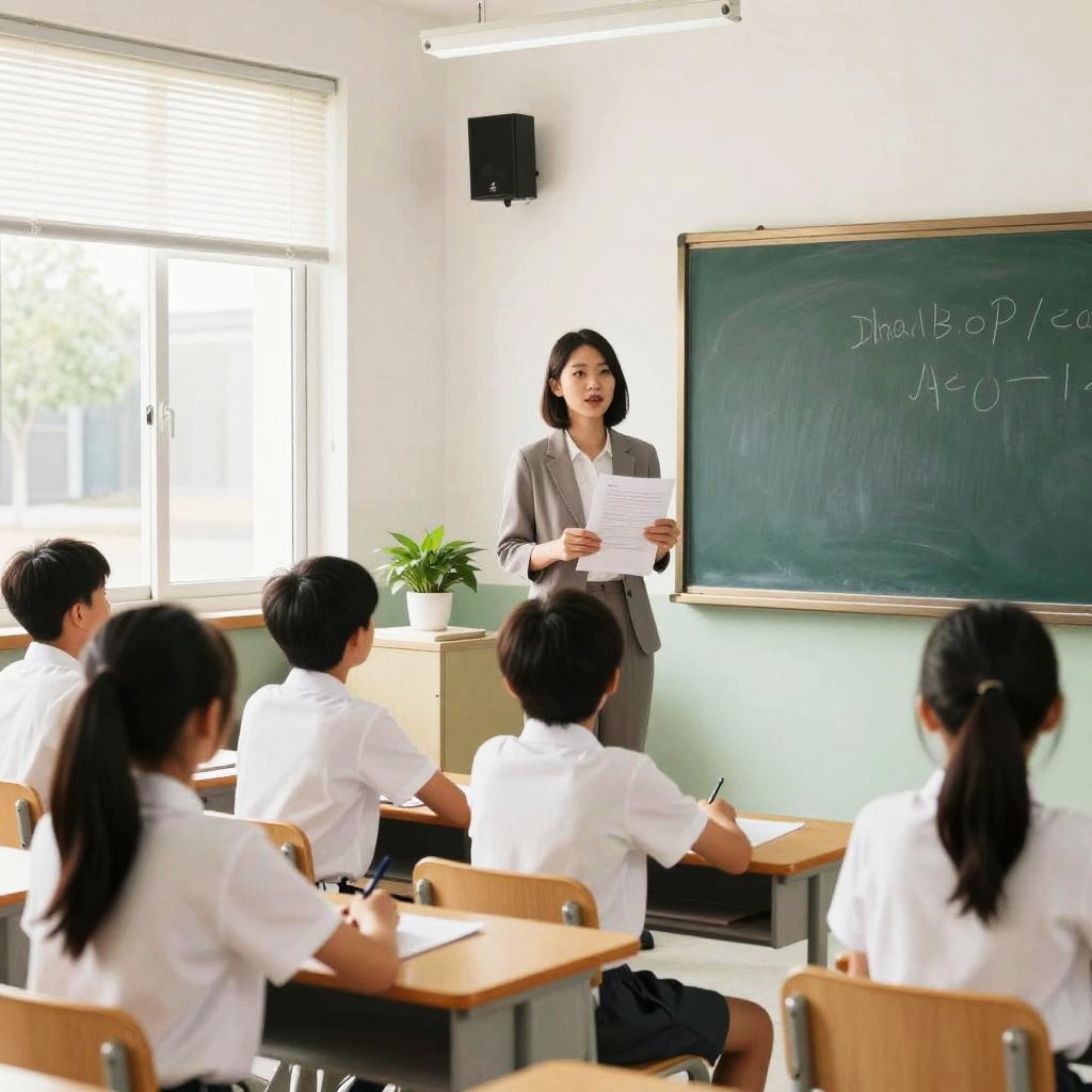 A classroom with a teacher standing in front of a chalkboard, holding a paper while addressing students who are seated at desks paying attention. The scene is lit by natural daylight coming through large windows with venetian blinds, capturing a realistic educational environment.