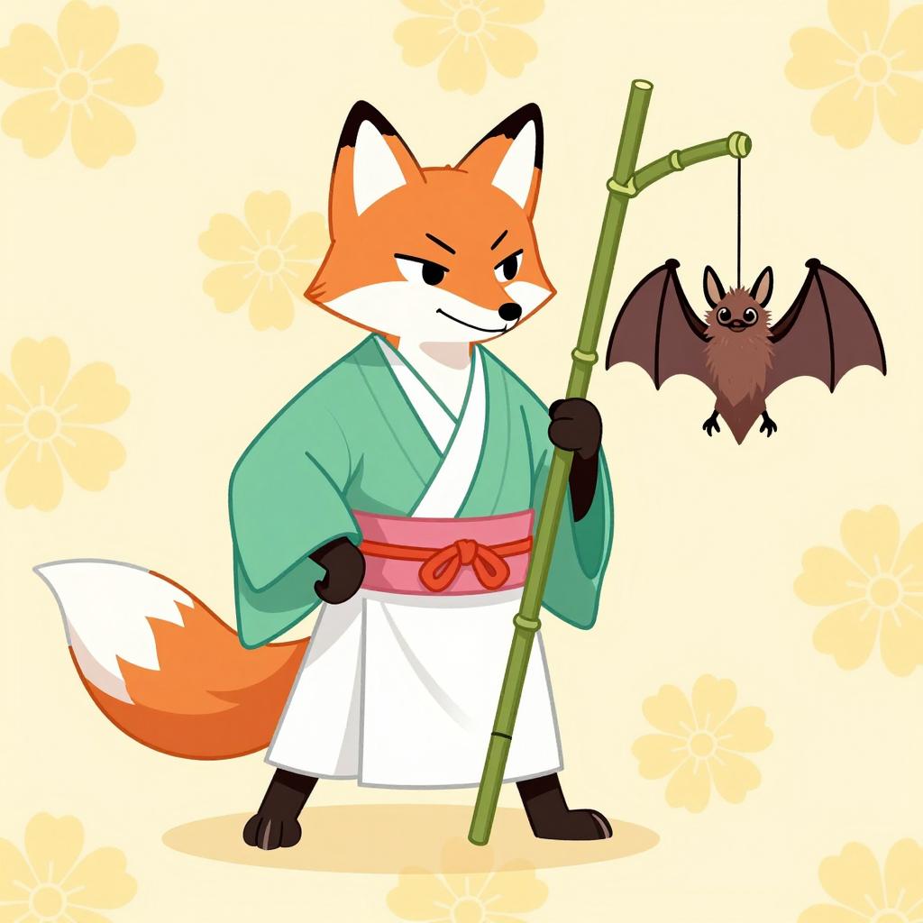 Illustration of a muscular, bearded man with long brown hair, red and blue drapery, and a green loincloth, standing on a tiled floor. He raises his right arm and holds a lantern in his left hand. Above him, a flying, humanoid fox with golden fur and blue wings. In the background, white buildings with red and blue Japanese characters. A small, green-clad figure lies on the floor to the left. Three Japanese characters on the right.
