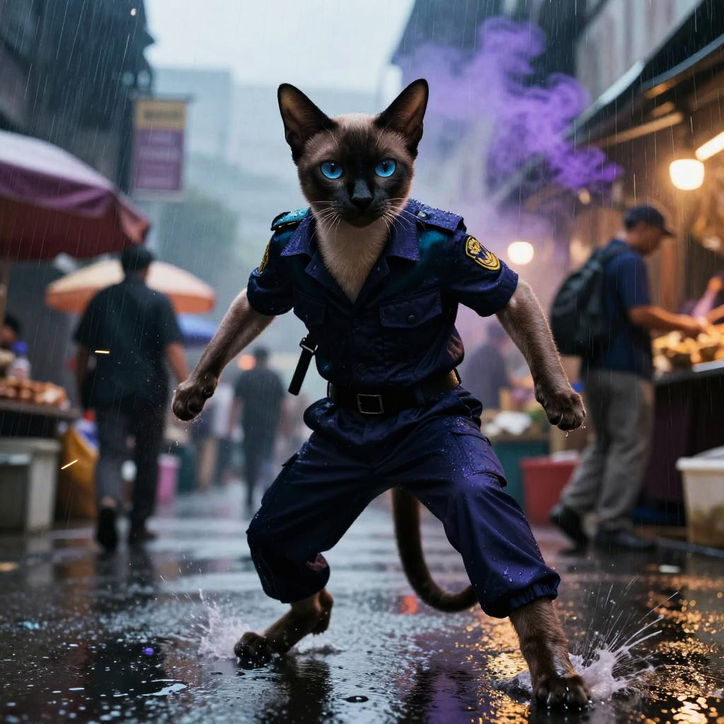 (full body) slender charcoal Burmese cat, undercover informant disguised in sleek street wear, in crowded market street drenched by nighttime rain, purple, teal, and gold predominate, hyper-detailing, hyper-realism, tack sharp, cinematic splash screen energy, action-packed composition, dynamic pose, rain and sparks, smoke plumes, glossy reflections, dramatic rim light, volumetric fog, motion blur trails, embers, HDR, film grain, photoreal lighting, rich textures, epic mood