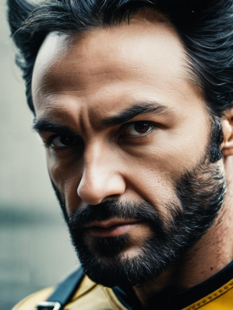 Detailed close-up headshot of a man with full black beard and prominent sideburns wearing a yellow Wolverine-inspired costume. The image captures intense facial expression with furrowed brows and dark eyes, highlighting facial textures and hair details. Background is blurred, focusing attention on the subject's face.