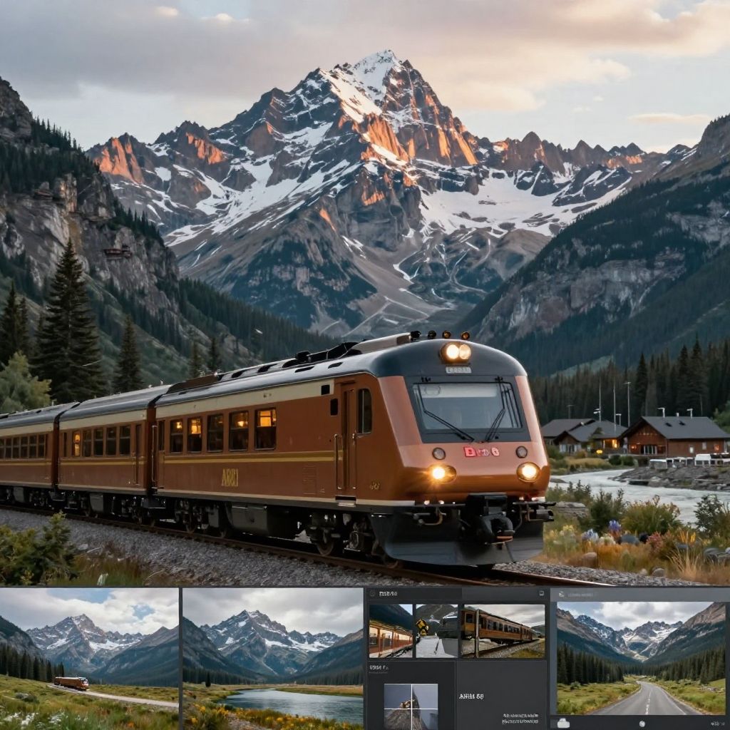 This photograph captures a modern, maroon and cream-colored train with "Rocky Mountaineer" emblazoned on its side, traveling through a scenic mountainous region. Snow-capped peaks dominate the background, bathed in the warm glow of the setting sun. The train is on a gravel track, with evergreen trees and a small, rustic lodge visible to the right. The foreground includes a composite panel displaying smaller images of the train and landscape. The sky is partly cloudy, adding depth to the overall scene. The image combines vivid colors and crisp textures, highlighting the contrast between the train and the majestic natural surroundings.