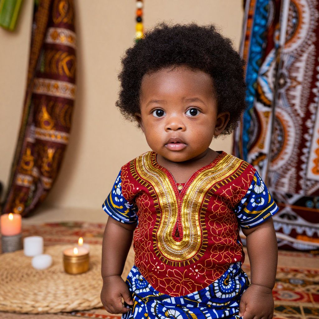 Realistic photo of a newborn with a soft, voluminous afro, dressed in a traditional African ceremonial costume with red, gold, and blue patterns, standing near a decorated family home with a woven mat, candles, and traditional textiles in the background, the baby has a healthy complexion, wide black eyes, and a calm, serene facial expression.