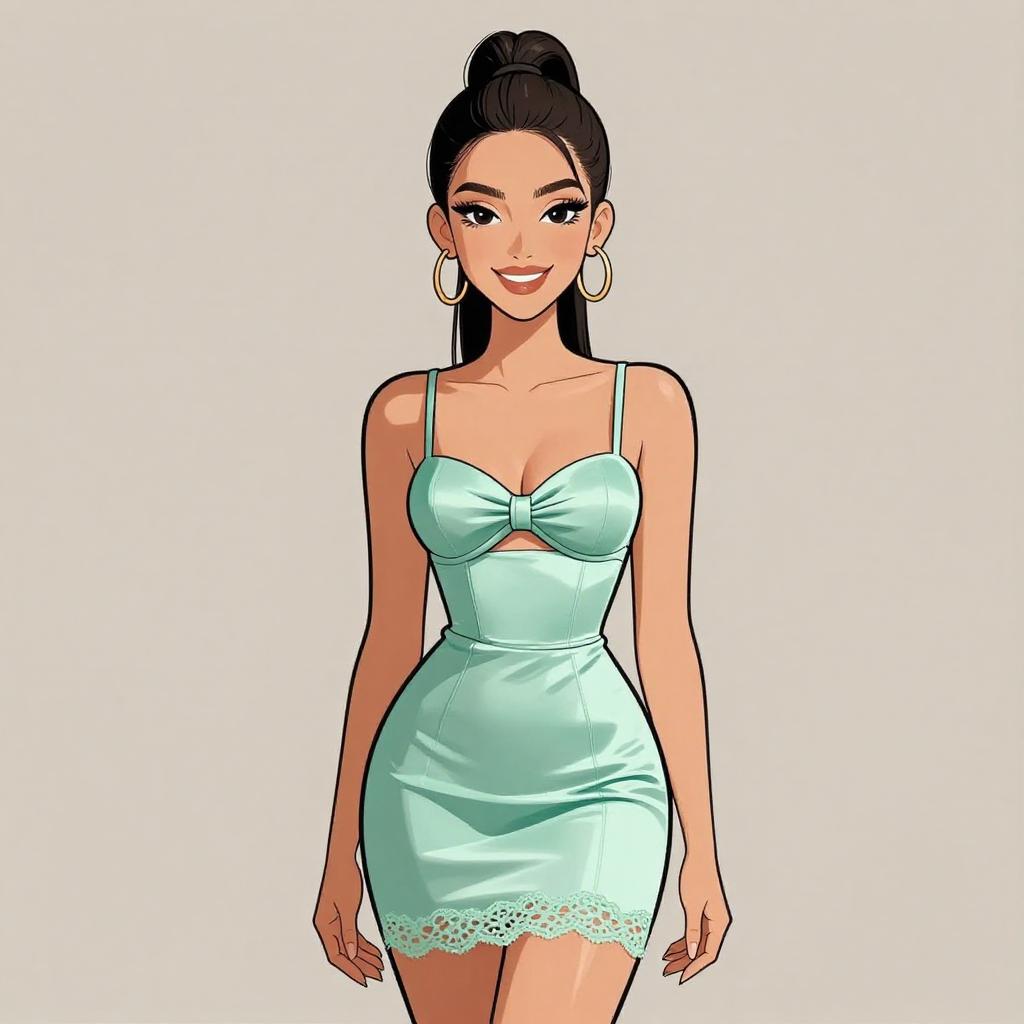 Woman with pretty face and pretty hair. smiling Woman, evening glam, metallic bodycon mini dress with a gradient transitioning from pink to gold, straight neckline, spaghetti straps, high shine finish, long silver tassel earrings, tattoos visible on arms, white studio background. --sref 1467