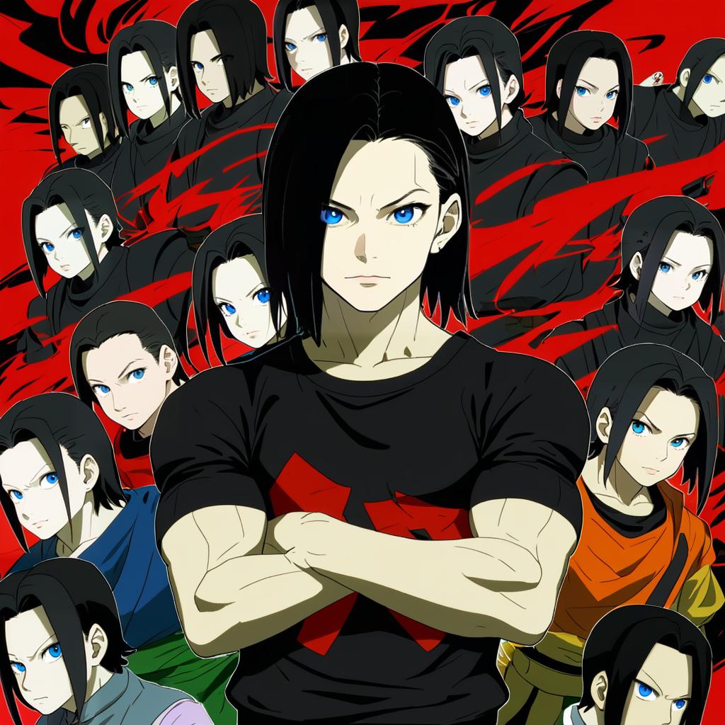 Digital artwork featuring multiple anime-style illustrations of Android 17 from Dragon Ball series. The character is depicted with short black hair and striking blue eyes, various facial expressions, and wearing different outfits including a black shirt with red Ribbon Army symbol and other colored clothing. The background incorporates red and black accents for dynamic contrast.