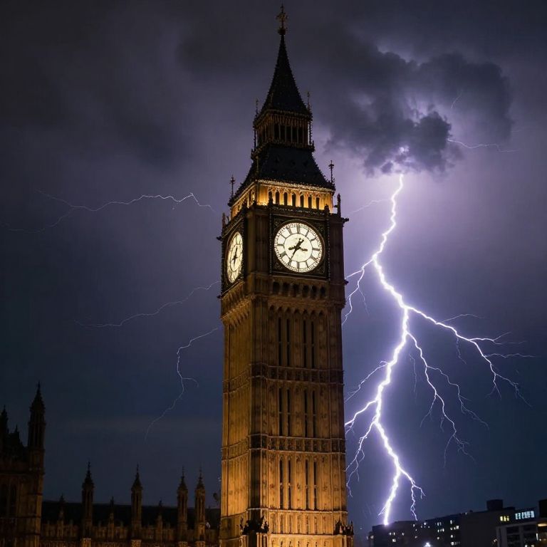 Photograph of London's Big Ben tower illuminated, with bright purple and white lightning bolts striking against a dark, stormy sky.