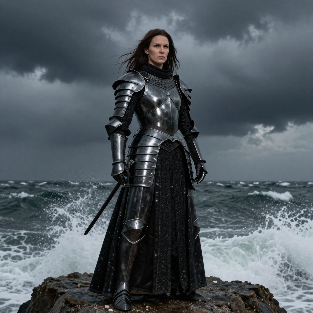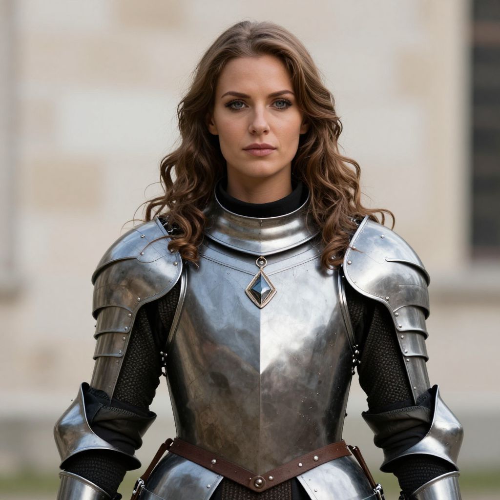 Photograph of a serious-looking woman standing confidently in a dimly lit room. She's wearing full medieval-style armor with a shiny silver chest plate, shoulder guards, and gauntlets. Her long black hair is straight and pulled back, and she's dressed in a gray, metallic-looking skirt that reaches her calves. She also wears black gloves and boots. The background is dark and blurred, putting focus on her.