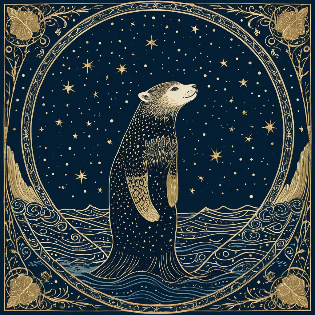 Celestial and magical illustration of a dullahan, in the style of Aubrey Beardsley and Beatrix Potter. Dark, starry blue background with gold leaf detailing, fantasy ocean setting, intricate and super-detailed with metallic and utopian elements.