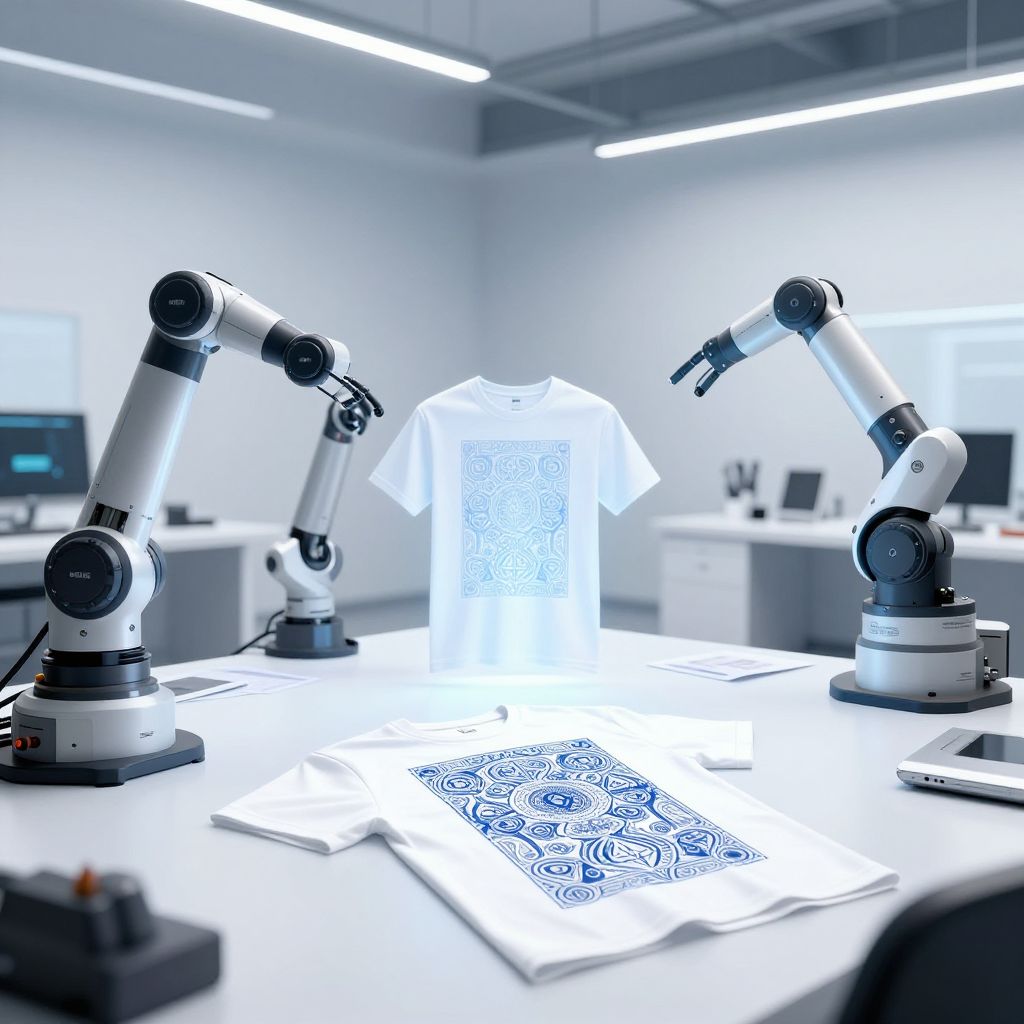 AI t-shirt generator imagining a high-tech fashion studio, robots and designers collaborating to create custom t-shirt prints, intricate pattern designs projected in 3D, modern minimalistic background, dynamic composition