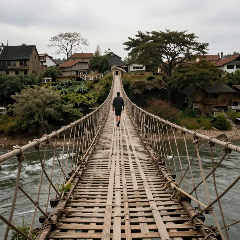 Photograph of a person walking alone on a long, narrow, wooden suspension bridge with rope sides, extending over a flowing river. The bridge leads to a hillside with several houses and trees. The person is dressed in black and is centered on the bridge. The sky is overcast, and the water below is visible through gaps in the bridge. The houses have red roofs and are surrounded by greenery. The bridge's wooden planks and rope sides create a textured, rustic appearance. The background shows a mix of shrubs and trees, adding to the natural setting.