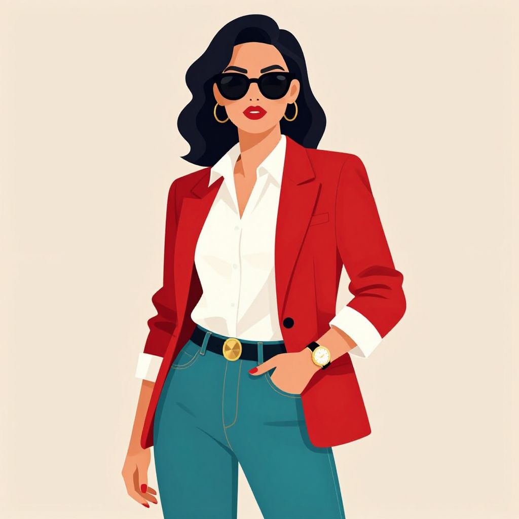 A stylish woman in a retro-inspired outfit, featuring a vibrant red blazer over a crisp white shirt, paired with teal jeans and accessorized with a gold watch and sunglasses, exudes a chic and confident vibe in this high-definition vector illustration.