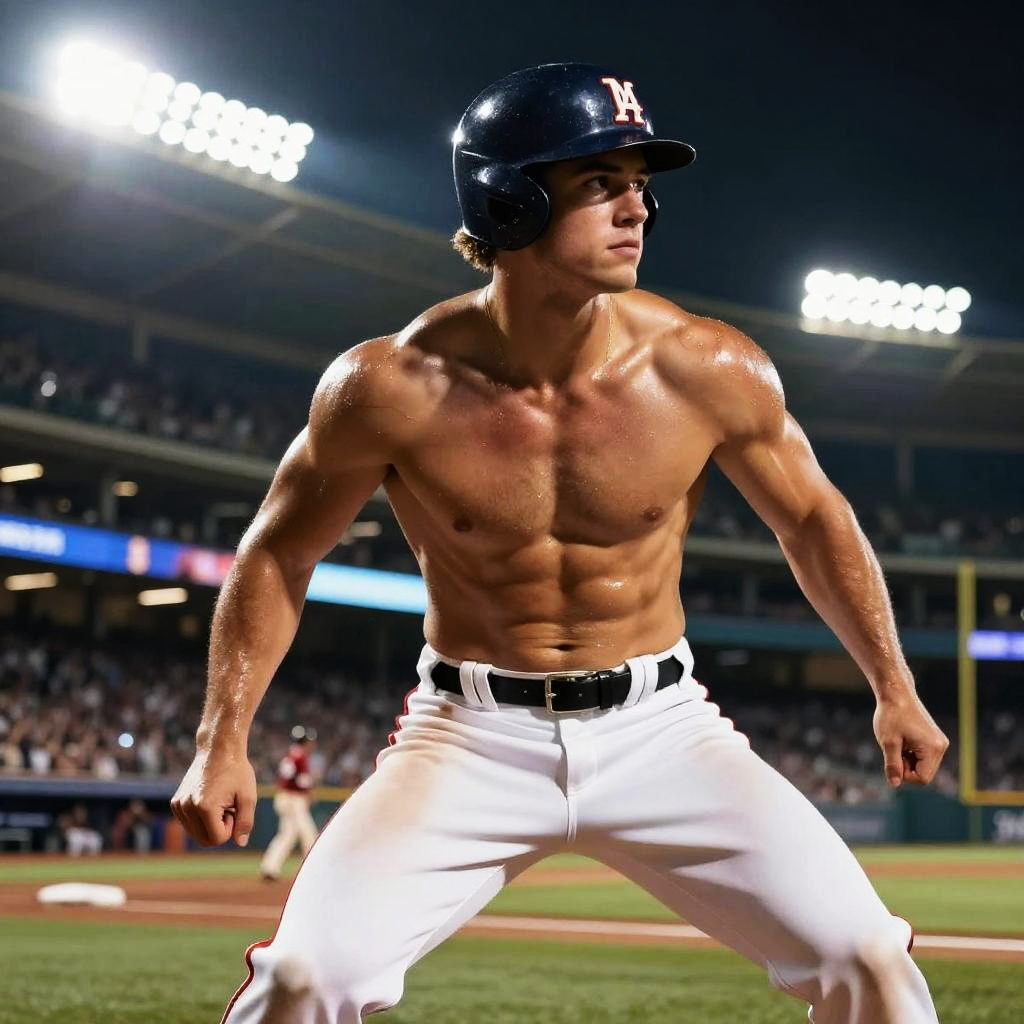 Max Muncy shirtless in a dramatic baseball stadium, muscular build glistening under bright floodlights, intense focus, dynamic pose, hyper-realistic style.