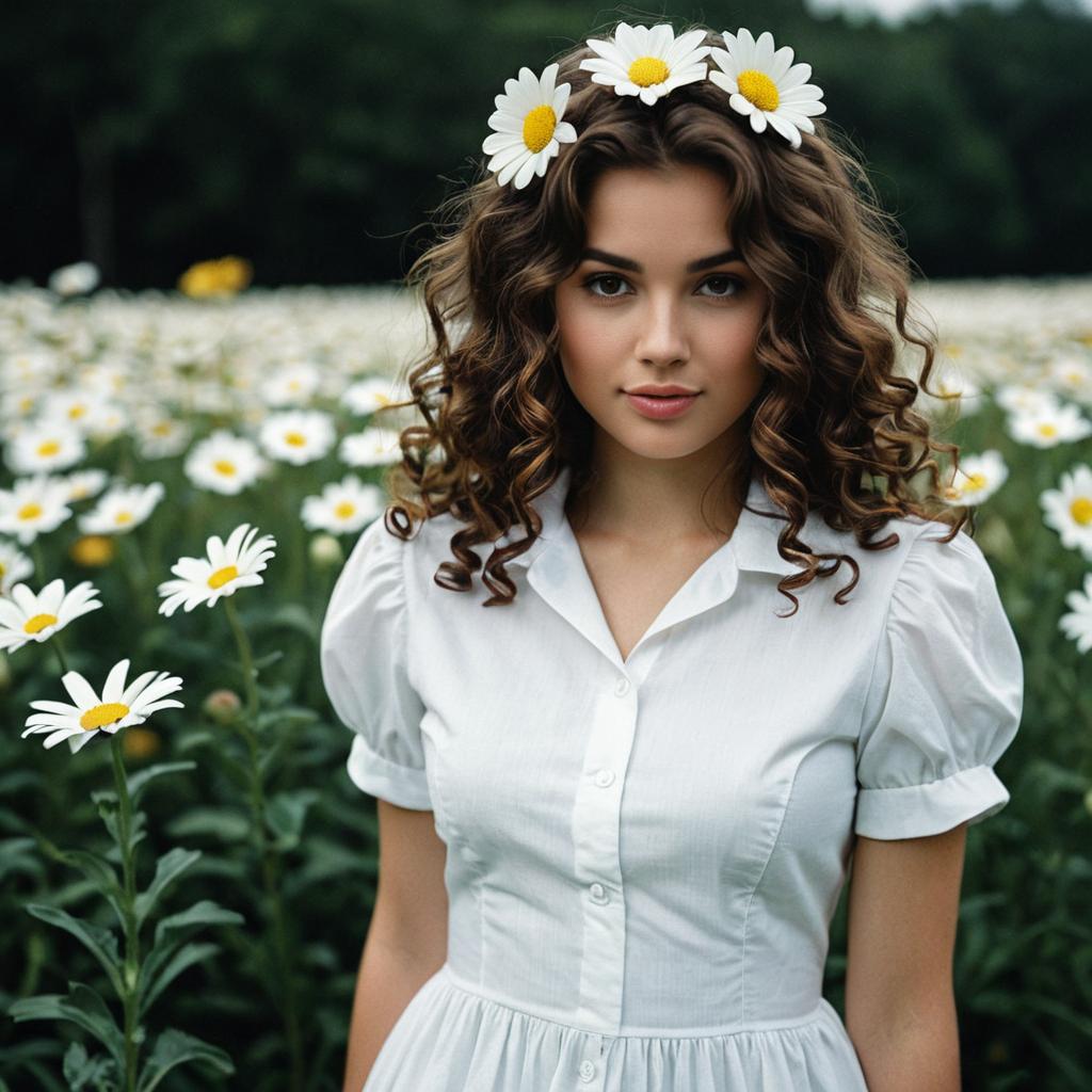 Euphoria fancy dress,1girl, solo, dress, flower, jewelry, realistic, necklace, long hair, brown hair, brown eyes, hair ornament, nature, yellow dress, looking at viewer