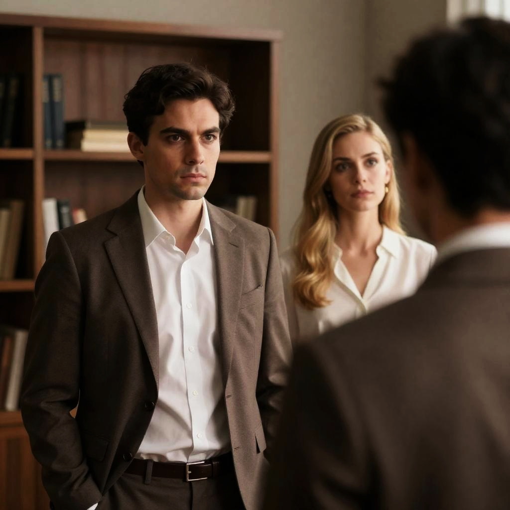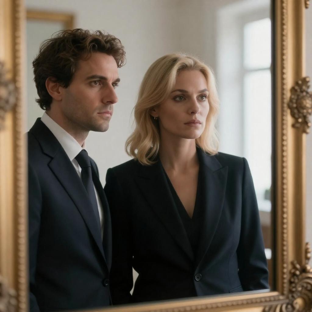 Photograph of a man and woman standing close in front of a large ornate mirror. The man, with dark hair and a serious expression, leans towards the blonde woman with a neutral expression. Both wear dark suits. The mirror's gold frame is on the right. The background is blurred and light.