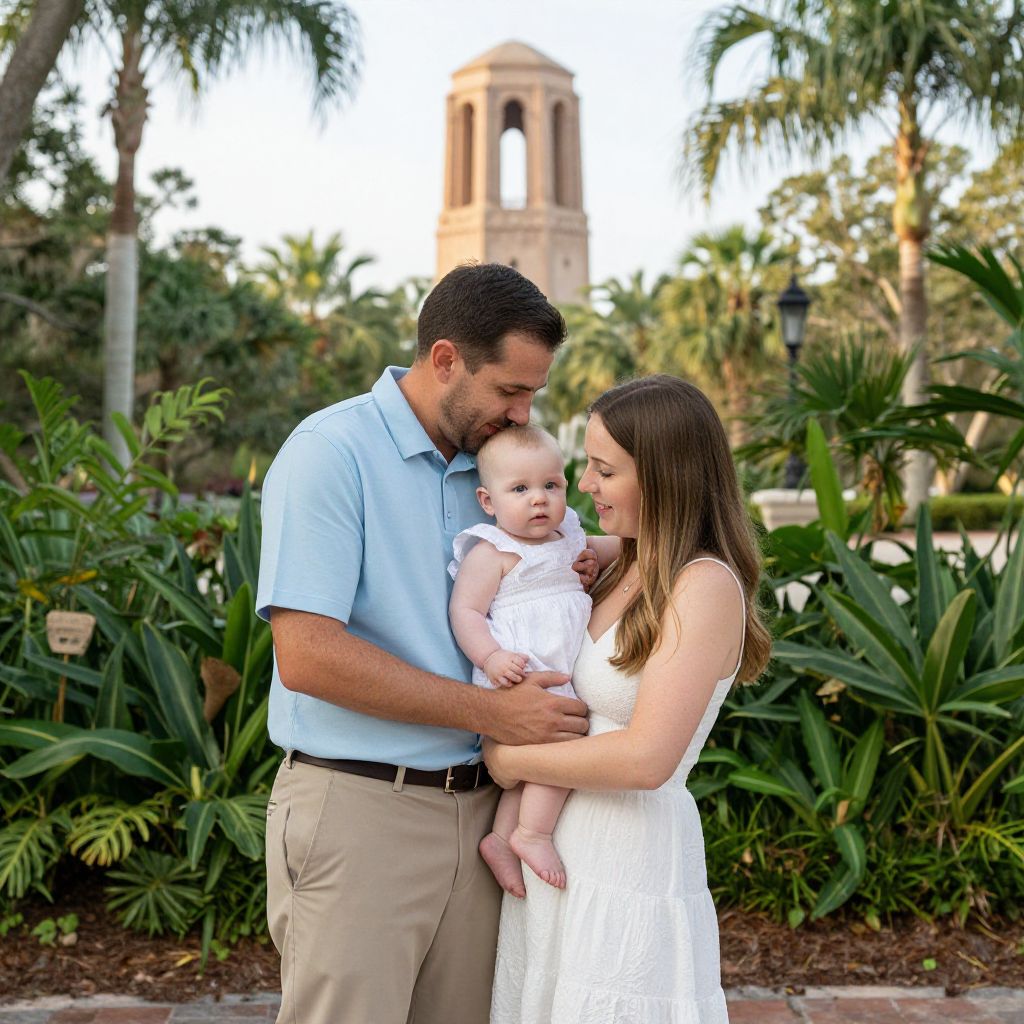 Family portrait captures a joyful moment at Bok Tower Gardens, Florida, featuring a man in a light blue shirt and khaki pants, a woman in a white dress, and a baby dressed in white, all sharing a tender embrace amidst lush greenery and palm trees.