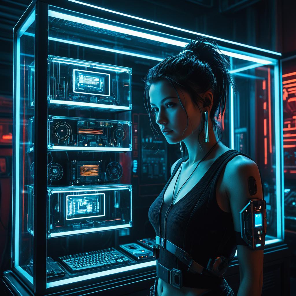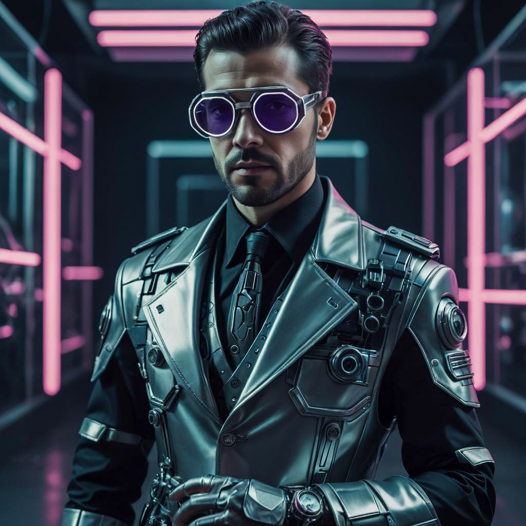 Detective outfit, worn by cyberpunk investigator, featuring reflective jacket and neon accents, in glowing pinks and cyans, captured in futuristic high-definition capture.