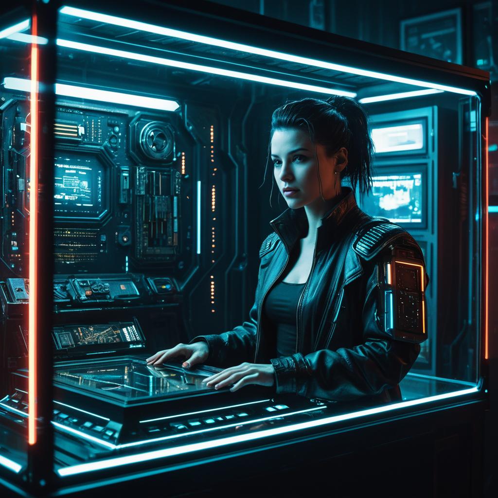 Portrait of a young female cyberpunk investigator wearing a shiny reflective pink jacket over black tactical attire. She stands confidently in a futuristic corridor illuminated by vibrant neon pink and cyan lights, creating a dynamic and high-tech atmosphere.