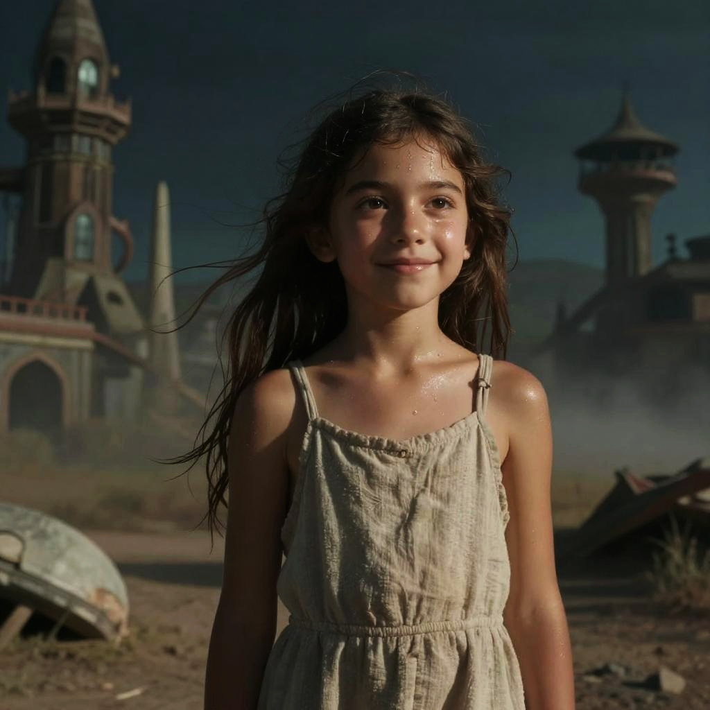 Post apocalyptic hair in loose, unkempt curls interwoven with dried plants and barbed wire, worn by a lone wanderer in a dusty desert environment with skeletal remains of factories in the background, moody and cinematic