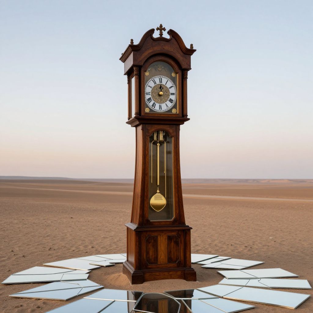 Colossal wooden grandfather clock stands solemnly amidst a vast desert landscape, its face marked by Roman numerals and golden pendulum swinging within a glass casing, surrounded by countless shattered mirror shards reflecting fragmented reflections beneath a serene sky.