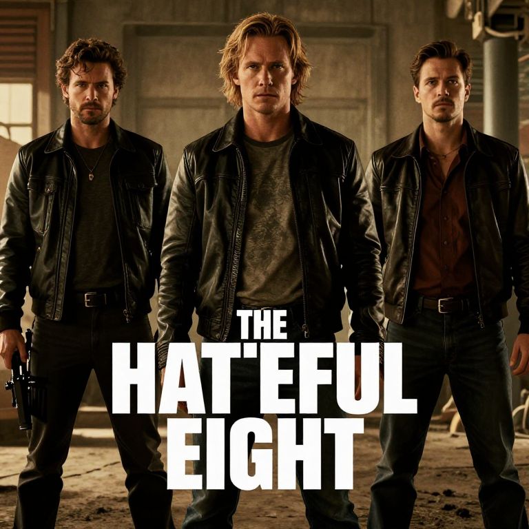 Photograph of three rugged men standing in a dimly lit, industrial setting. The central man with shoulder-length blond hair and a serious expression wears a black leather jacket over a dark t-shirt. Flanking him are two men with dark hair and beards, also in black leather jackets. The background features worn, concrete walls and a window with barred glass. Bold white text at the bottom reads "THE HATEFUL EIGHT." The men exude a tough, post-apocalyptic vibe with their intense stares and dark, utilitarian clothing. The lighting is dramatic, highlighting their faces and jackets.