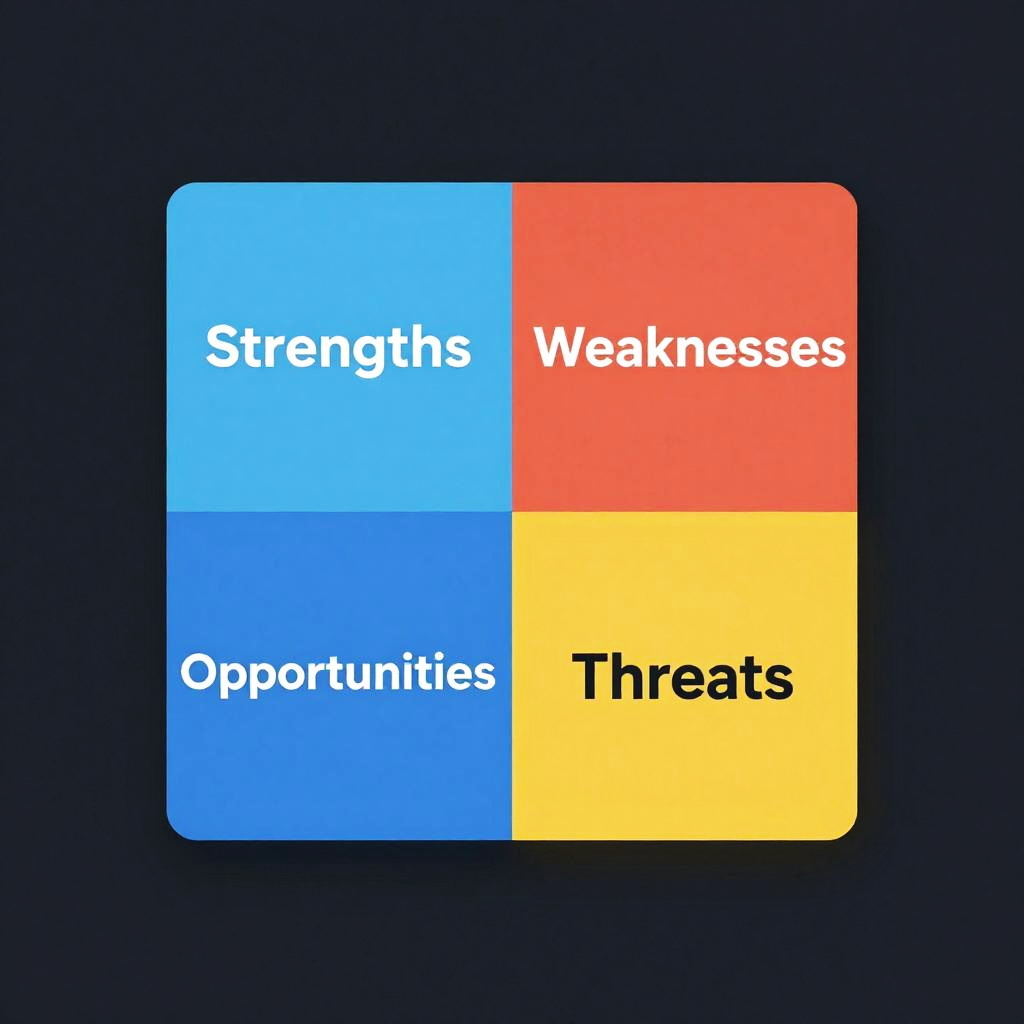 Swot concept illustrated as a dynamic business infographic split into four quadrants labeled Strengths, Weaknesses, Opportunities, and Threats with vibrant colors and modern flat design, set against a sleek dark background.