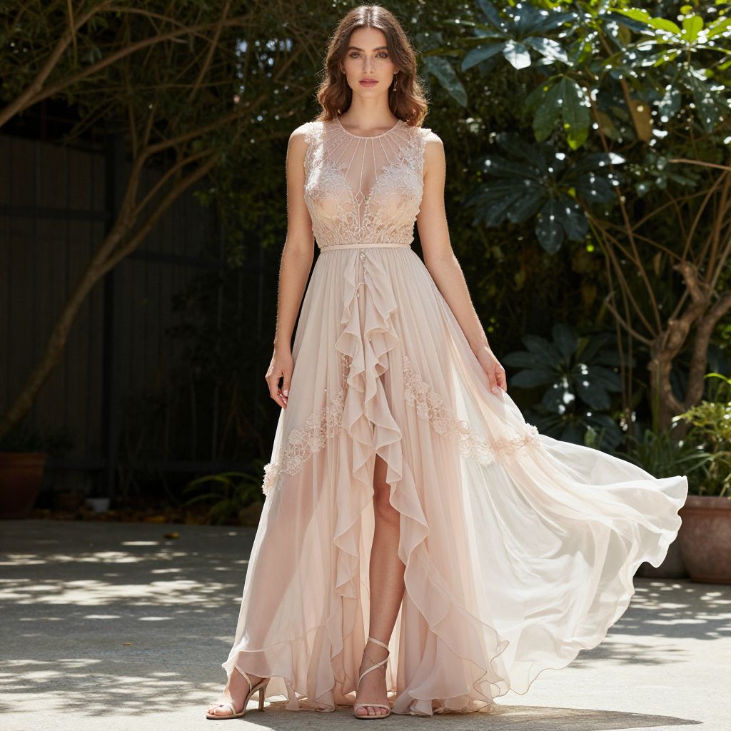 Full body shot, woman, sheer sleeveless dress, delicate mesh overlay, high neckline, flowing silhouette, soft pastel colors, intricate lace detailing, layered ruffles, lightweight chiffon fabric, cinched waist, asymmetrical hemline, elegant strappy sandals, minimalistic jewelry, subtle makeup, soft waves hairstyle, outdoor garden setting, natural sunlight, dreamy atmosphere Sexy. Pretty face and beаutiful eyes. Big breasts