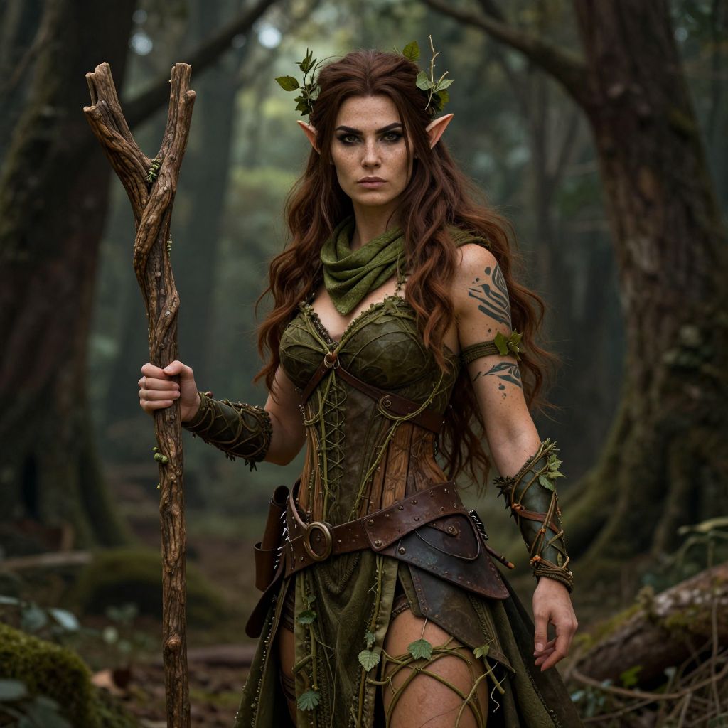 Digital fantasy artwork of an elven woman with long brown hair, pointed ears, green leafy attire, and tattoos, holding a wooden staff in a