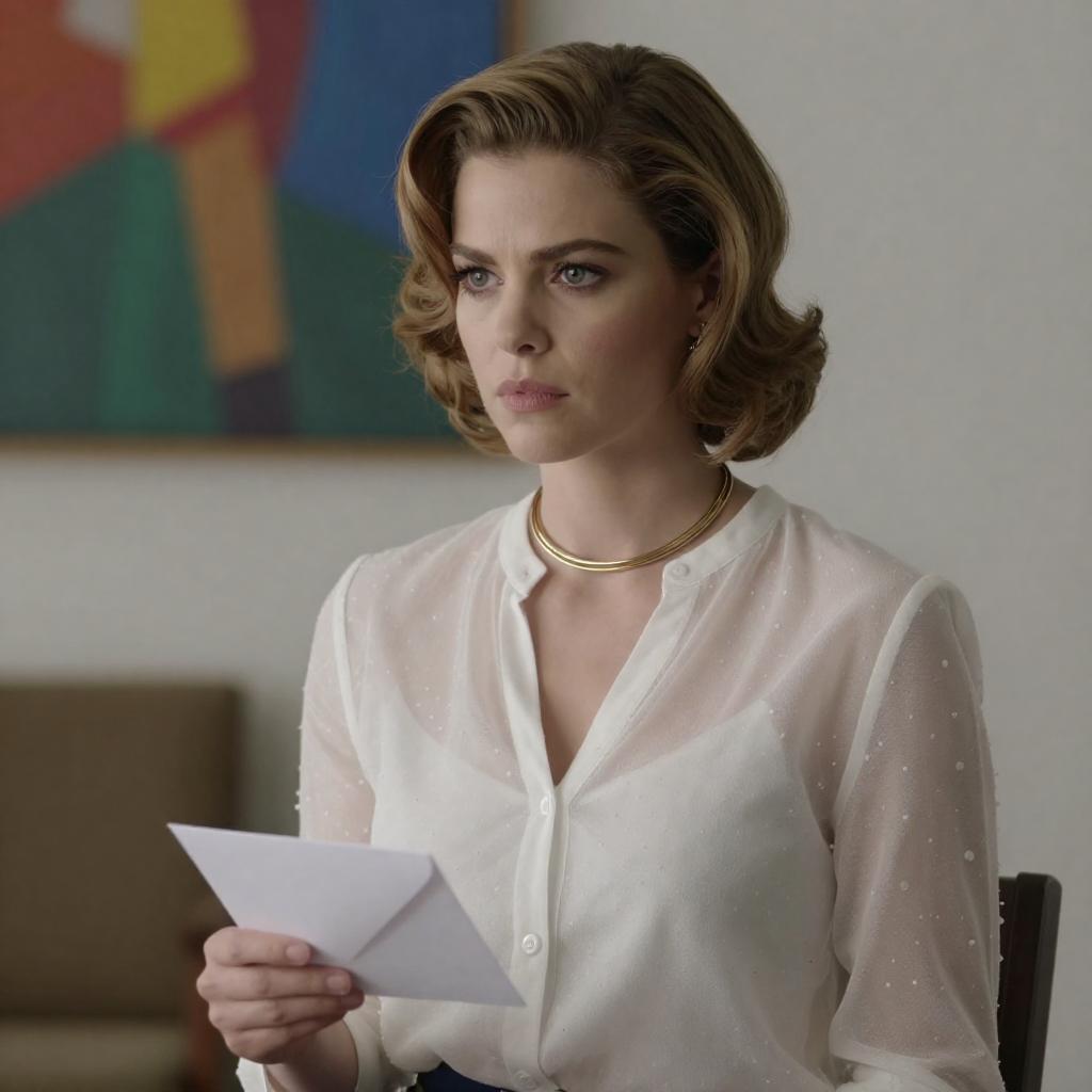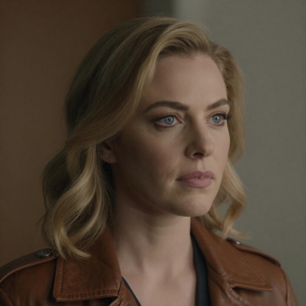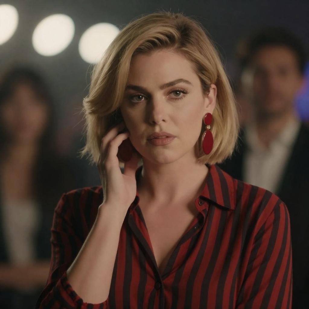 Photograph of a blonde woman with short, layered hair and dark roots, wearing a red and black striped shirt and large red earrings. She has a serious expression, with one hand touching her face. The blurred background features bright lights and indistinct figures. The image has a cinematic, dramatic feel.