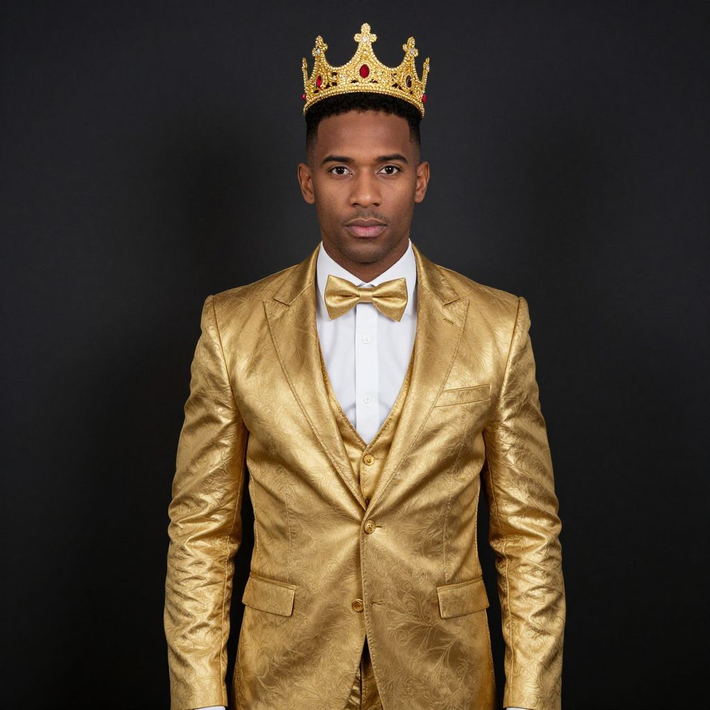 Photograph of a young Black man with short, neatly styled hair, wearing a shiny, gold-colored suit with a white dress shirt and a gold bow tie. He also sports a gold crown with ornate designs on his head. His expression is neutral, and he stands against a solid black background. The suit has a subtle floral pattern and fits him well, emphasizing his tall, slender build. The overall image has a formal, regal feel with a pop of royalty due to the crown.