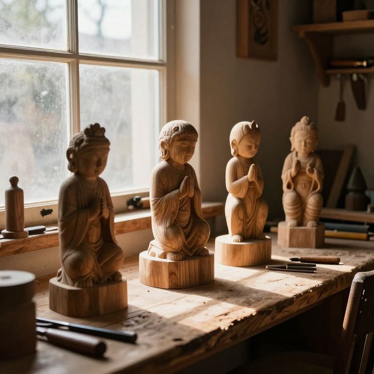 Woodworks featuring intricate hand-carved wooden sculptures in a cozy artisan workshop, warm sunlight streaming through dusty windows, detailed textures of wood grain and carving tools scattered on aged workbenches, a rustic, inviting atmosphere
