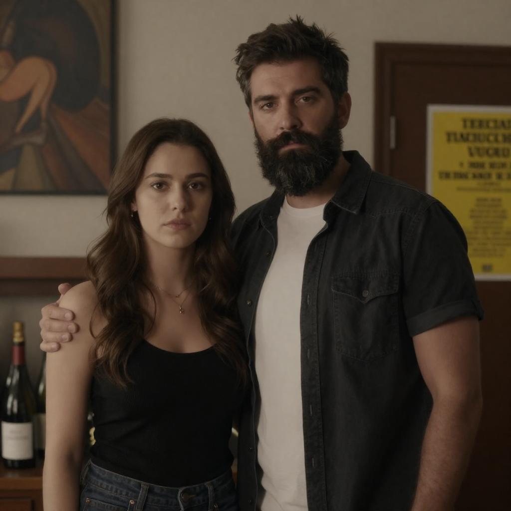 Photograph of a man and woman in a dimly lit room. Man with dark beard, black and white shirt, arm around woman. Woman with long brown hair, black sleeveless top, serious expression. Background includes wine bottles, wall art, door with yellow poster. Man stands slightly behind woman, both facing camera.