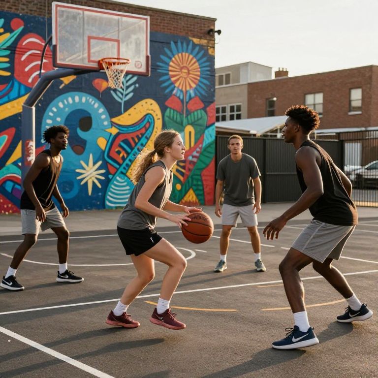 A white girl with black guys playing basketball on an outdoor court, dynamic action shot, vibrant colors, urban background with murals, energetic and sporty vibe, warm sunset light highlighting movement and teamwork.