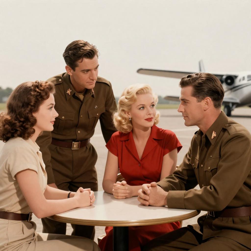 Photograph of a 1950s-style diner. Four people: two men in beige military uniforms, one with dark hair and another with lighter hair, and two women, one with red hair in a blue floral dress, another with short blonde hair in a white dress. Men stand and sit around a wooden table with turquoise and blue boxes. Background shows busy diner with other patrons. Men have "A" patches on their uniforms. Women smile at each other. Bright, lively atmosphere.