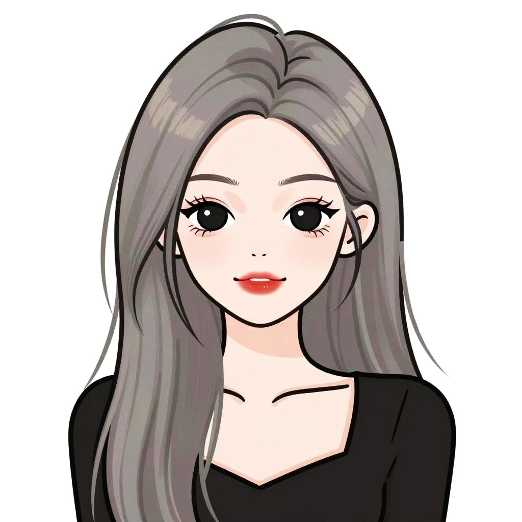 This is a digital drawing of a cute woman with long, straight, silver-gray hair and fair skin. She has thick, dark eyebrows, big black eyes with long lashes, and red lipstick. She's wearing a black top with a low neckline that shows a bit of cleavage. The background is plain white, making her the focal point. The style is cartoonish with smooth, clean lines and vibrant colors.