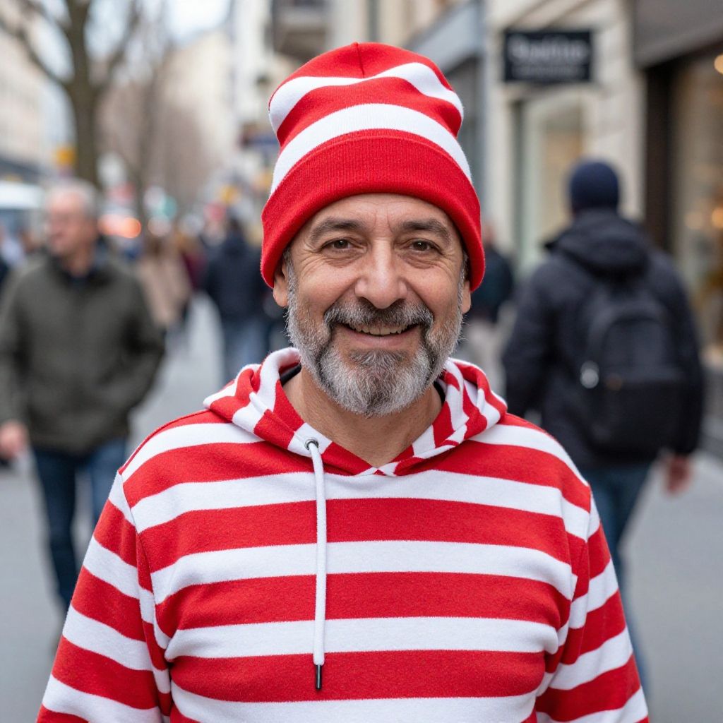 A cheerful middle-aged man with a gray beard smiles warmly at the camera while wearing a red and white striped hoodie and matching tall hat. The street scene behind him is slightly blurred, showing pedestrians and urban architecture, creating a lively and casual atmosphere.
