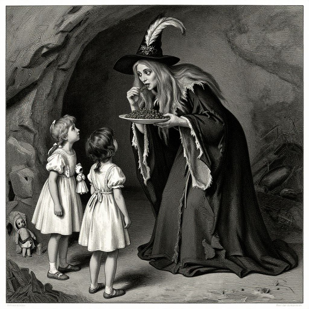 In this antique manuscript illustration by Arthur Rackham, the scene depicts a man eating witch, a character from the fairy tale \"Hansel and Gretel,\" standing in a dark, cave-like setting. The witch, with long, gray hair and a mischievous expression, holds a platter of raisins in her hand, offering them to the two children, Hansel and Gretel, who stand in awe. The children, dressed in simple, white dresses, are accompanied by a small doll, adding to the sense of innocence and vulnerability. The witch's attire is a mix of rustic and fantastical elements, with a tattered cloak and a hat adorned with a feather. The background features textured, rocky walls, enhancing the eerie atmosphere of the scene. The overall composition is balanced, with the witch centrally positioned, drawing the viewer's attention to her and the children's reactions. The use of dark tones and muted colors creates a sense of mystery and tension, while the raisins on the platter add a touch of whimsy and contrast to the otherwise somber setting.