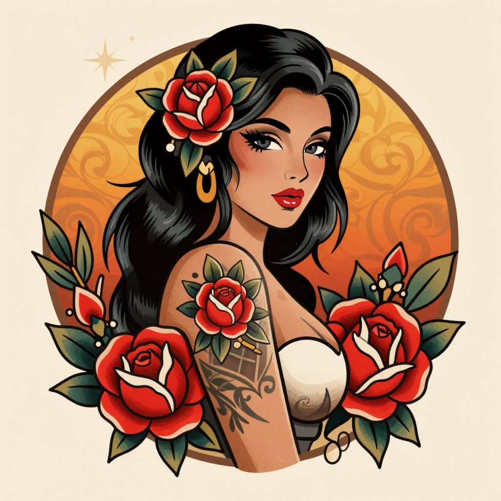 A vintage-inspired vector illustration featuring a woman adorned with intricate floral tattoos and vibrant red roses, set against a warm, circular backdrop with ornate leafy accents, evoking a classic tattoo art aesthetic.