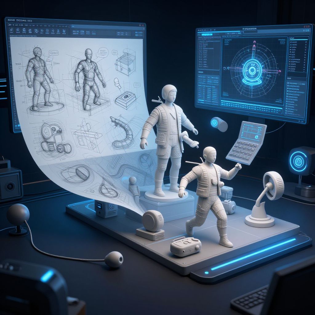 Digital CGI illustration of a futuristic design studio. Two white, humanoid mannequins, one standing and one reaching forward, are situated on a glowing blue platform. A large, holographic blueprint of a person in various poses and mechanical parts hovers above them. Surrounding the platform are multiple high-tech monitors displaying blue-lit technical schematics and data. A keyboard, mouse, and tablet are scattered on the dark, sleek desk. The scene is bathed in cool blue and white light, emphasizing the high-tech, futuristic design aesthetic.