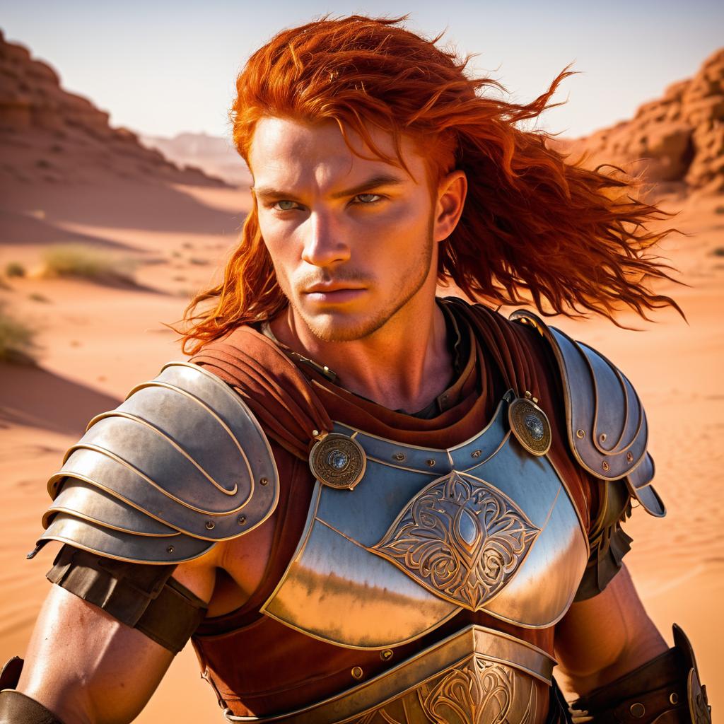 Portrait of a muscular young Celtic warrior with freckled skin, fiery red hair, and a fierce gaze. Set in a desert wearing armor, inspired by Tyler Jacobson, Greg Rutkowski, Alphonse Mucha.