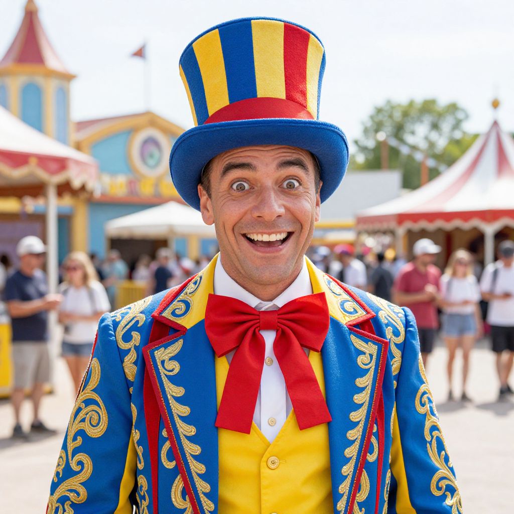 Photograph of a cheerful man in a colorful, ornate circus performer outfit. He's wearing a tall, striped top hat, a vibrant blue and yellow jacket with gold patterns, and a red bow tie. His eyes are wide open, and he's smiling broadly. The background shows a bright, sunny carnival with blurred, colorful buildings and a few people in the distance.