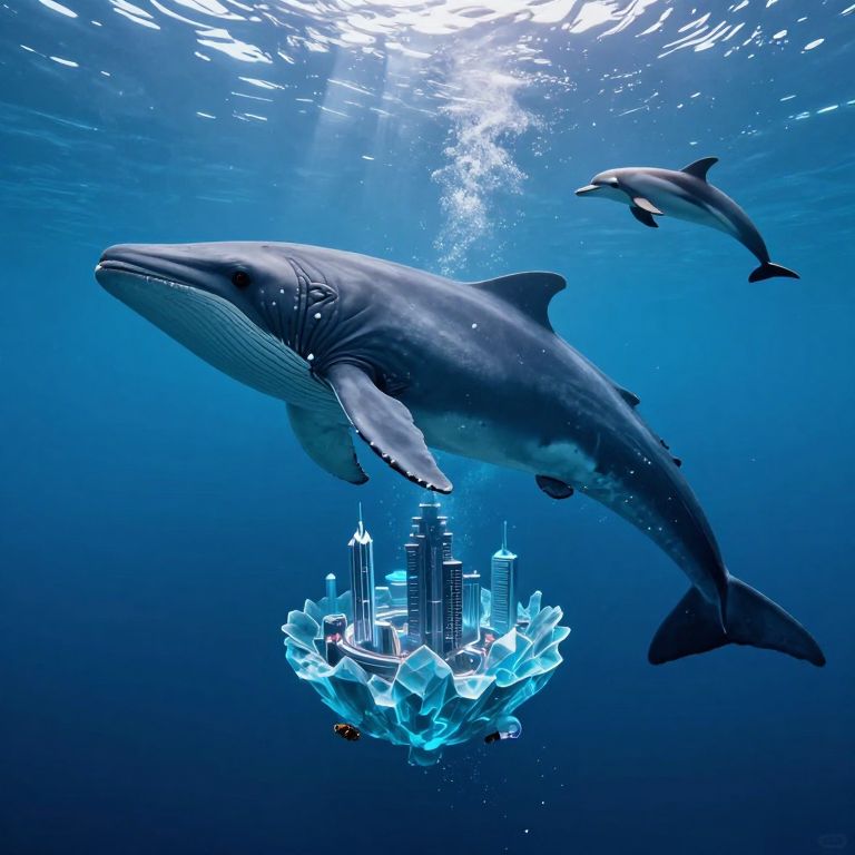 A colossal leviathan drifts serenely underwater, its massive form dwarfing a futuristic cityscape that emerges from its crystalline belly, while dolphins glide gracefully between the surreal world above and the luminous depths below.