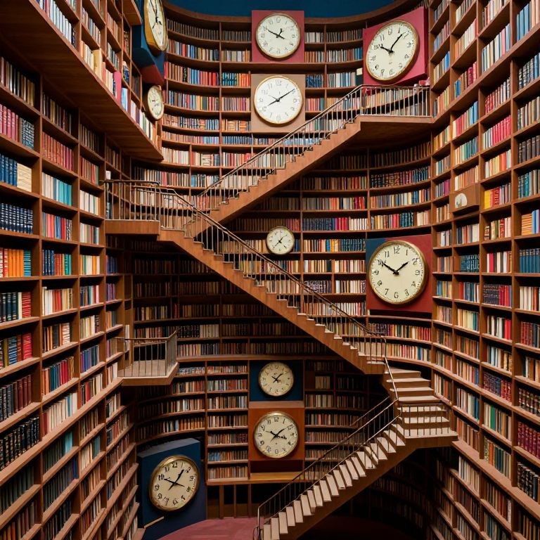 Photograph of a grand library interior featuring tall, circular shelves filled with colorful books. A wooden staircase with metal railings spirals from the bottom center to the top, intersected by multiple large, round clock faces displaying different times. Clocks are evenly spaced around the shelves, adding a rhythmic pattern. The shelves are packed tightly with books of various sizes and colors, creating a vibrant, textured background. The overall atmosphere is warm and intellectual, with a focus on symmetry and verticality. The image is rich in color and detail, emphasizing the organized chaos of a vast book collection.