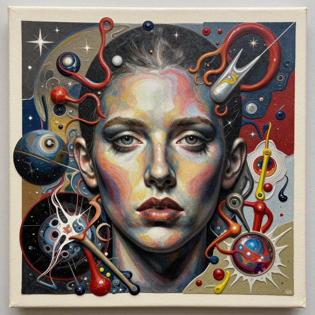 Layered celestial orgasm detailed and highly reliefed analogue mixed media collage with canvas texture in style of contemporary art, punk art, single realistic face, photorealistic, expressionism, masterpiece, perfect composition, hd quality, intricate details