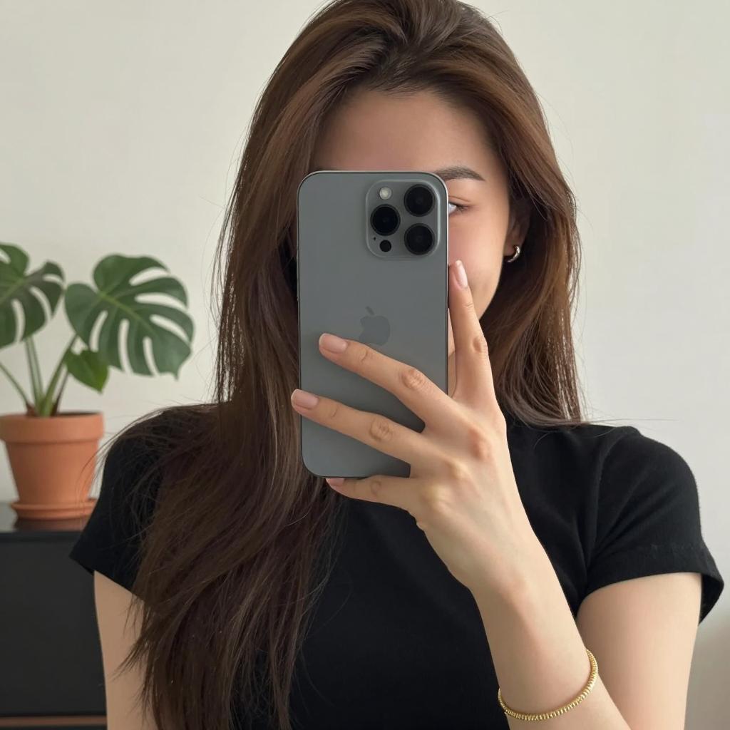 Woman with long straight brown hair, wearing black short-sleeve shirt, taking selfie with gray iPhone. She has light skin, full lips, and wears gold bracelets and ring on her left hand. Potted plant in background. Her face is partially obscured by phone. She has a slight smile. Two camera lenses visible on iPhone.