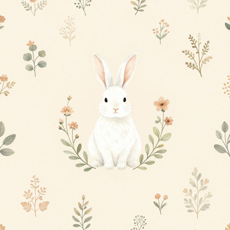 Illustration of a white rabbit sitting in the center surrounded by delicate boho-style flowers and leaves. The design features a repeating forest pattern with muted pastel colors on a light beige background, showcasing a naïve art style.