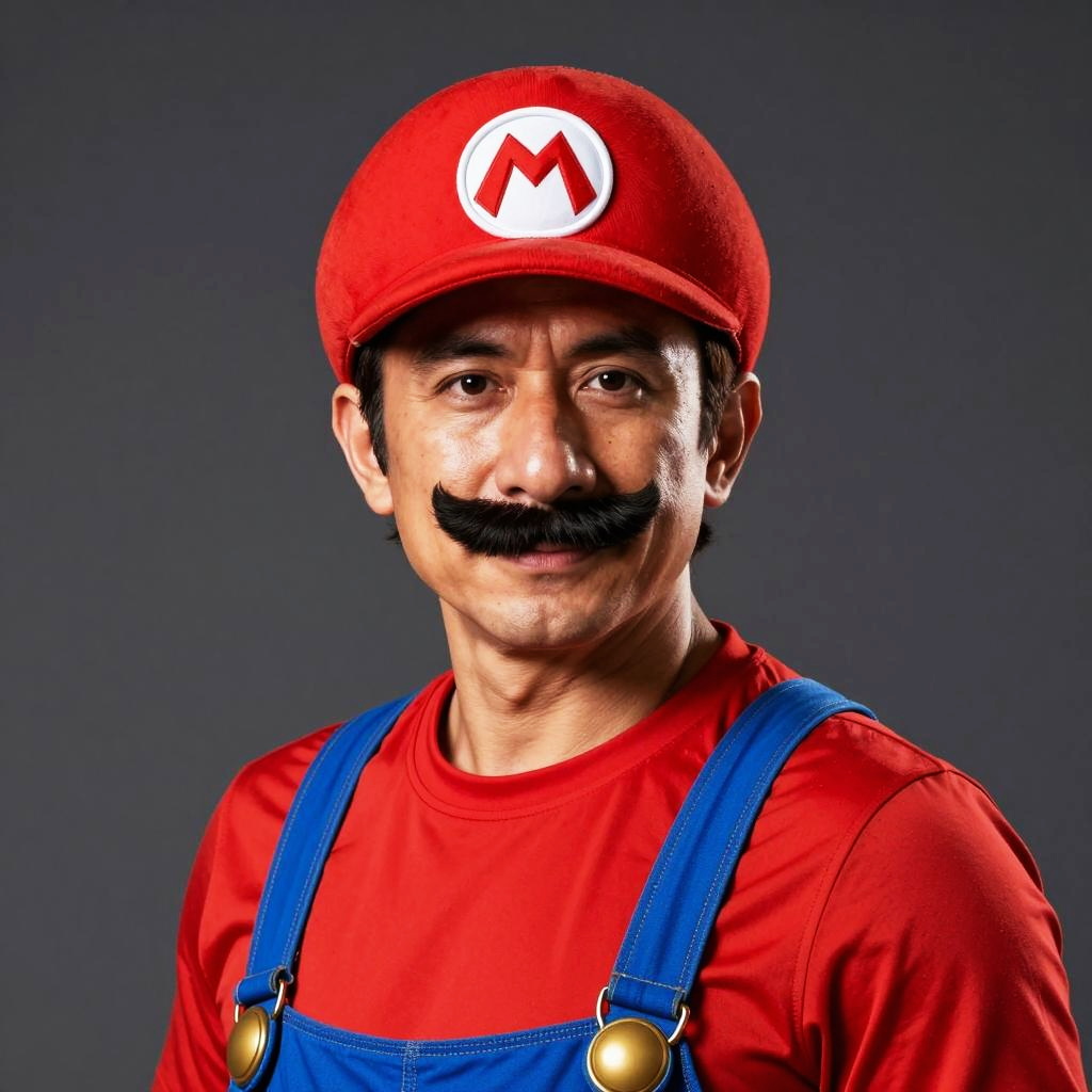 Portrait of an adult Asian man wearing a detailed photorealistic Mario cosplay costume. He sports a bright red hat with the iconic 'M' emblem, a matching red shirt, blue suspenders, and a thick black mustache. The image features cinematic lighting that highlights the man's facial features and the costume's textures against a plain dark gray background.